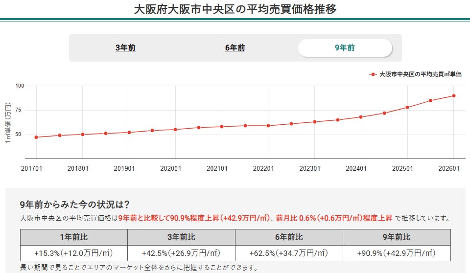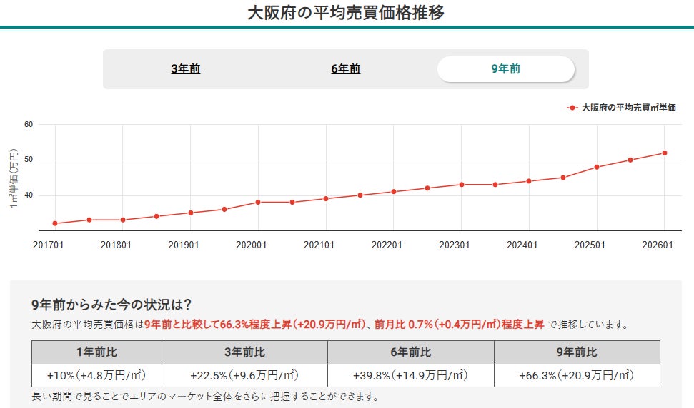 2. 2026年1月時点の大阪府全体の平均売買平米単価は9年前比で66.3%程度上昇し、継続的に右肩上がりの傾向