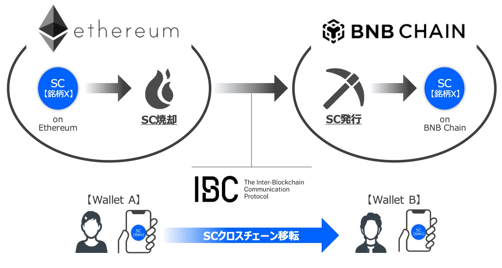このうち、スマートコントラクト開発については、SCの登録・発行・移転といった標準機能の開発がすでに完了しており、複数のパブリックチェーン(EthereumとBNB Chain)のテストネット環境において、異なるブロックチェーン間でSCの移転取引が正常に実行されることが確認できています。
