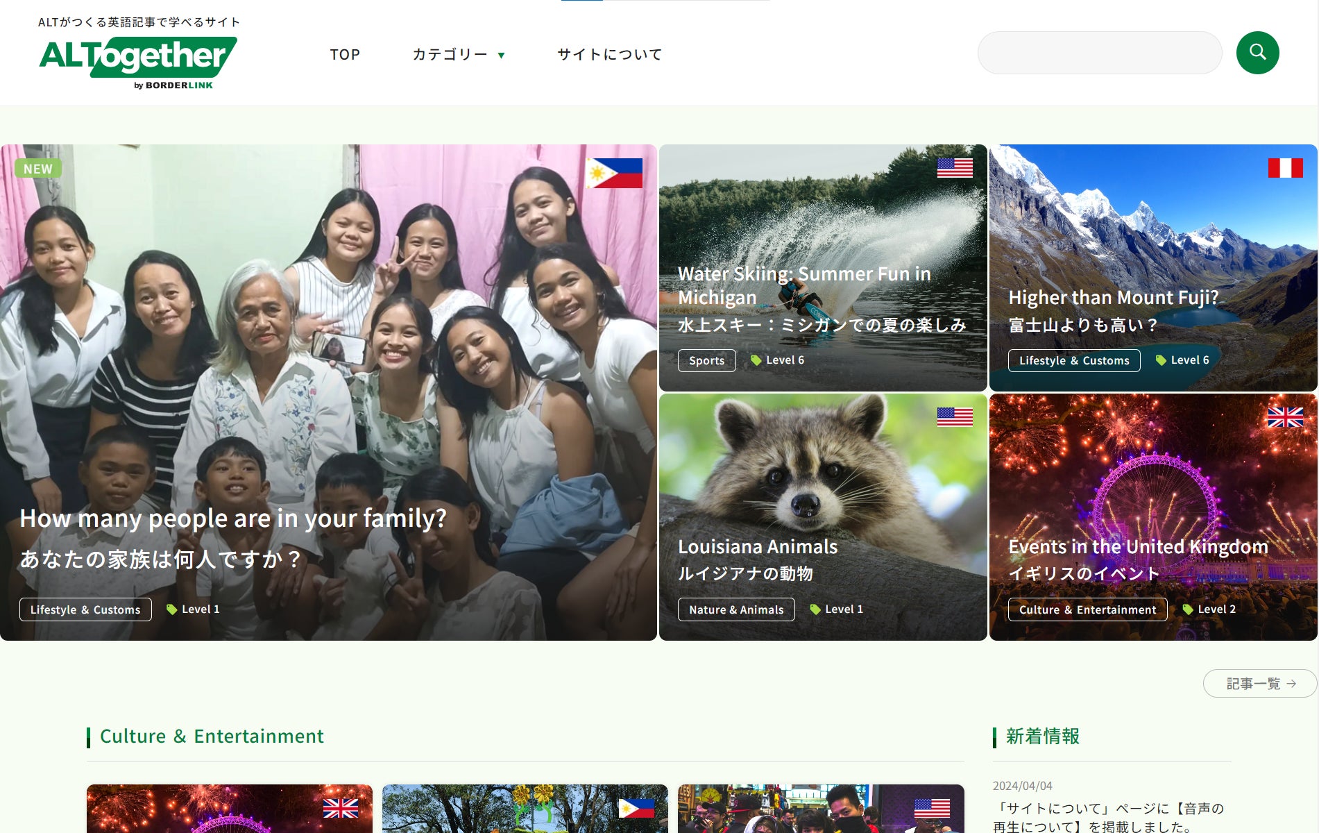 ALTogether(オルトゥゲザー)は、世界のさまざまな国・地域出身のALTたちが、自国および日本で経験したことをもとに書いた記事を通して、単に英語を学ぶだけでなく、異なる価値観や文化、習慣、地理などについて理解を深められる学習サイトです。