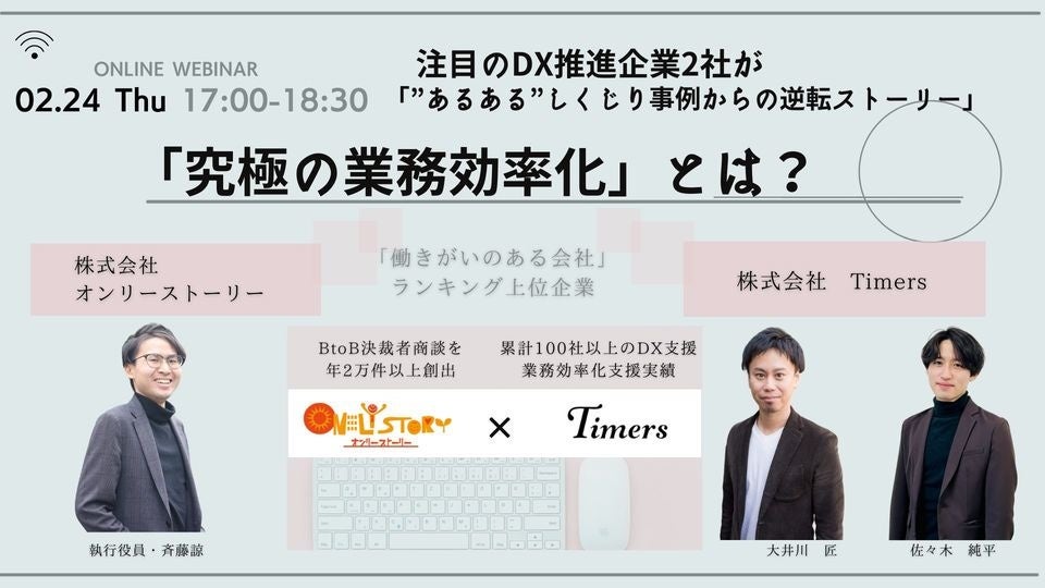 審査制・決裁者マッチング支援SaaS「ONLY STORY(URL:https://onlystory.co.jp/ )」を運営する株式会社オンリーストーリー(代表取締役:平野哲也、本社:東京都渋谷区)は、2月24日(木)17:00~無料ウェビナー「注目のDX推進企業2社が語る”あるある”しくじり事例からの逆転ストーリー」を開催いたします。