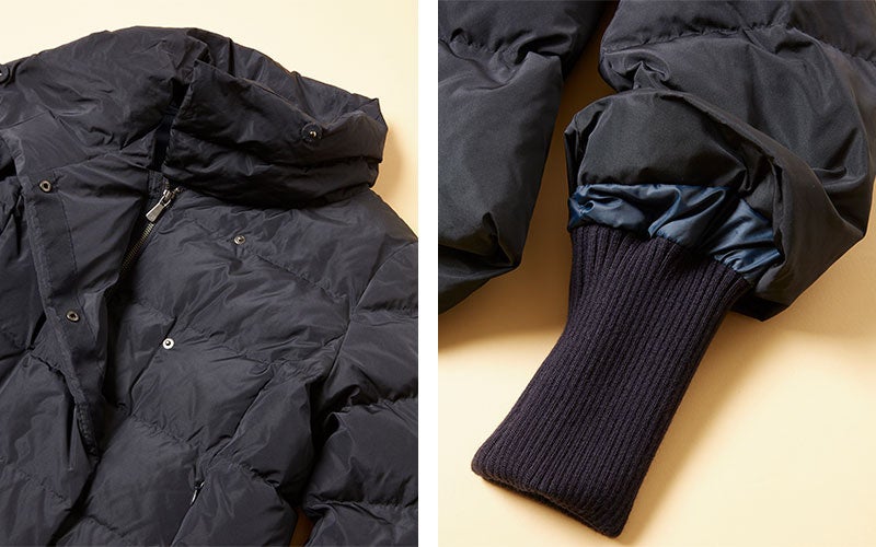 表地の素材はマイクロタフタ。形状記憶性があるので、薄手による軽やかな着心地を享受しながらシワになりにくいのです。袖先を短くしあえてリブを長めに見せているのも見どころ。ワイドな襟がボリューム感を主張しつつも、全体としては着膨れして見えないよう計算されており、軽さとあたたかさを楽しみつつ、あくまで都会的な洗練さを纏います。