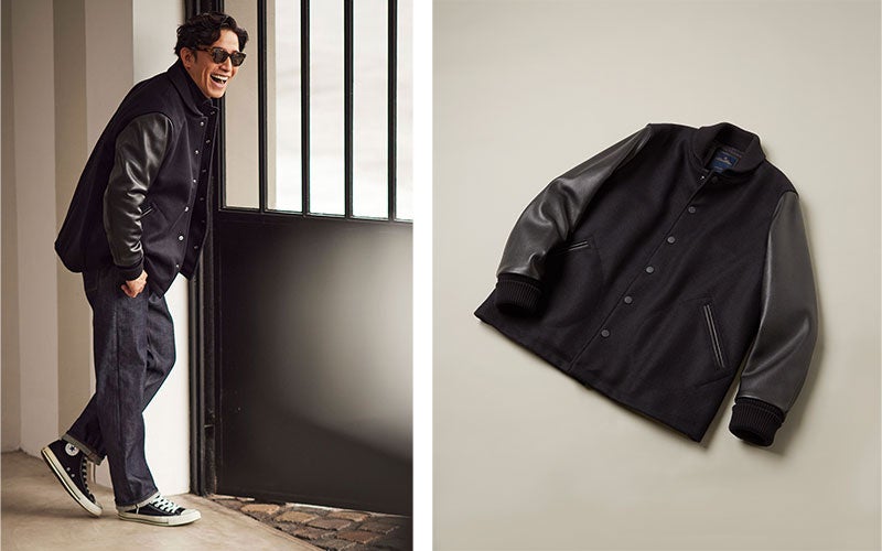アメリカントラッドへの注目が集まる昨今。アウターにおいては、やはりこんなジャケットが気になります。ハリがありながらも堅苦しさのないウールメルトン製の身頃と、しなやかなシボ入りの袖。大学の代表スポーツチームに由来するバーシティという名を冠したそのジャケットは、ゆえにセルビッジデニムにハイトップのキャンバススニーカーというカレッジスタイルでまとめるのが定石でしょう。とはいえ、ハイゲージのタートルネックニットを合わせれば、一転して大人顔に。