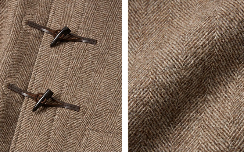 重厚感のあるトグルボタンには水牛の角を、ボタンループにはリアルレザーが使用されています。ウール100%のヘリンボーン織り生地しかり、天然にこだわった素材使いにより、上質感をアピールしてくれます。
