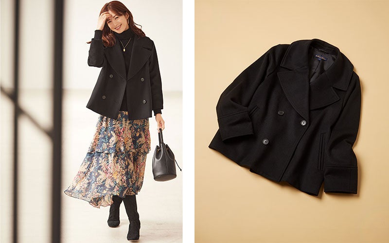 レトロなボタニカル柄がプリントされたセパレートスカート。大人のエレガンスが漂うそのシルエットに、着丈の短いピーコート風のショートコートがメリハリを効かせます。ピーコートが持つ本来のマスキュリンなイメージも、軽くやわらかなウールメルトンなら一変、女性らしさを引き立てます。幅広のラペルさえも、むしろ優しい印象に。一方で、タートルネックニット、ロングブーツをブラックで揃えることで、落ち着いた大人な雰囲気も。そんな2面性こそ、このコートの魅力だと言えるでしょう。