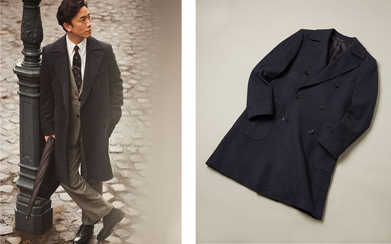 漁師や戦艦乗組員の防寒着といった背景がありながら、アイビースタイルにおける定番コートでもあるだけに、どこか愛らしさがあるのがダッフルコートの面白いところ。ウールをヘリンボーン織りしたあたたかみに溢れるこんな1着なら、なおさらです。コーデュロイパンツとの相性は言わずもがな。ミックスグリーンのウールニットにチェック柄のマフラーを差し色として効かせれば、その印象はオトコらしくもスイート。まさしく、ホリデーシーズンにぴったりなコーディネートを楽しめます。