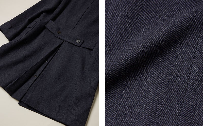 インバーテッドプリーツやマーティンゲールと呼ばれるバックウエストのベルトも、1910年代当時のデザインを継承。上質なウール製ヘリンボーン織り生地は、しっかりと目が詰まっていながらも、いざ触れば膨らみを感じさせます。