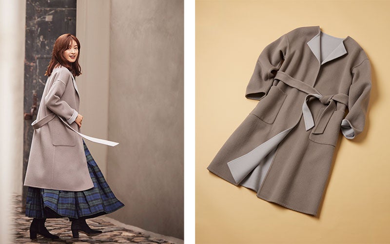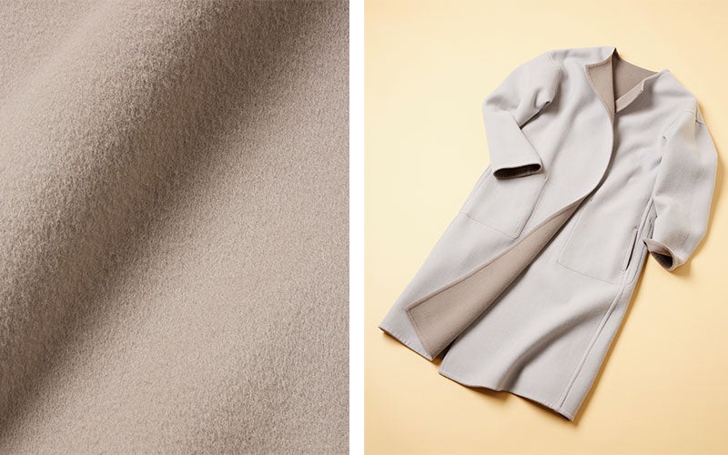 ビーバーの毛並みに着想を得る、繊細な起毛加工。どちらの面も、優しい肌触りとふわりとエアリーな風合いを楽しめます。異なる色のリバーシブルは、首元や襟先、裾から覗く他方の色によるアクセントを可能に。