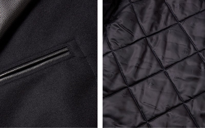 程よい厚みのウールメルトンは、イギリスの名門ムーン社によるもの。ハリがありつつもドレーピー、そして繊細な起毛感が、上質さを訴えます。鈍くも美しい光沢を披露するカウレザーも、また同様に。ショールカラーの襟と2つ折りにした袖先のリブに加え、中綿をキルティングしたライナーに採用することで、保温性も備えています。