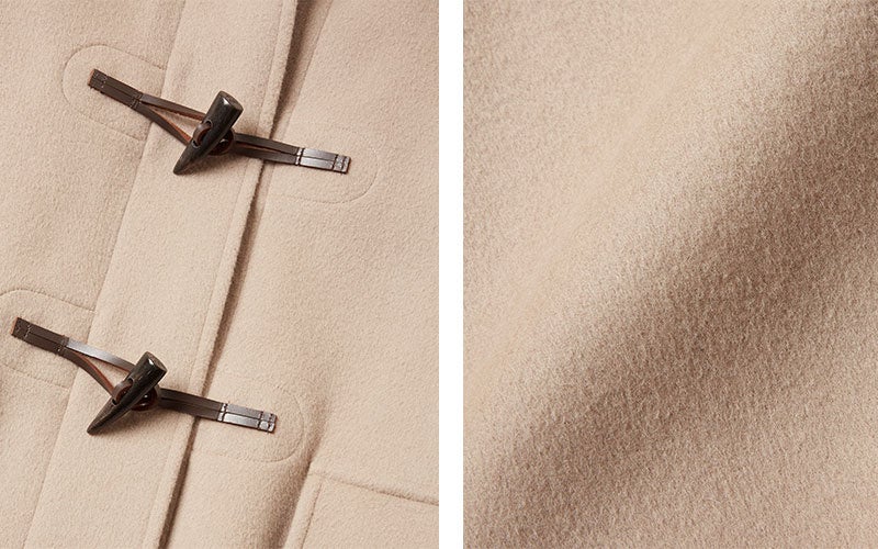 トグルボタンには水牛の角を使用。ボタンループにもレザーを用いるなど、ダッフルコートの伝統的な意匠が採用されています。原毛の繊細さを際立たせるビーバー加工が、歩く度に美しいドレープを描いてくれます。