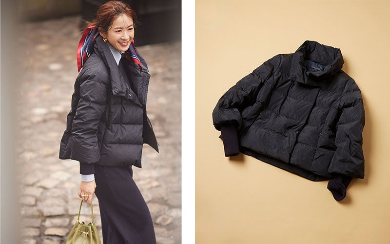 軽くてあたたかい。その両立において、ダウンはこの上ないアイテムでしょう。ジャージー素材のワンピースとなら、快適さは言うまでもなし。しかし、大切なのはそこにスタイルがあるか。ショート丈にデザインされたダウンジャケットは、なおかつ身幅を広く取り、さらにワイドな襟が華やかさをアピールします。ロング丈のワンピースとでメリハリあるシルエットを楽しめば、色を使わずとも表情豊かなコーデに。