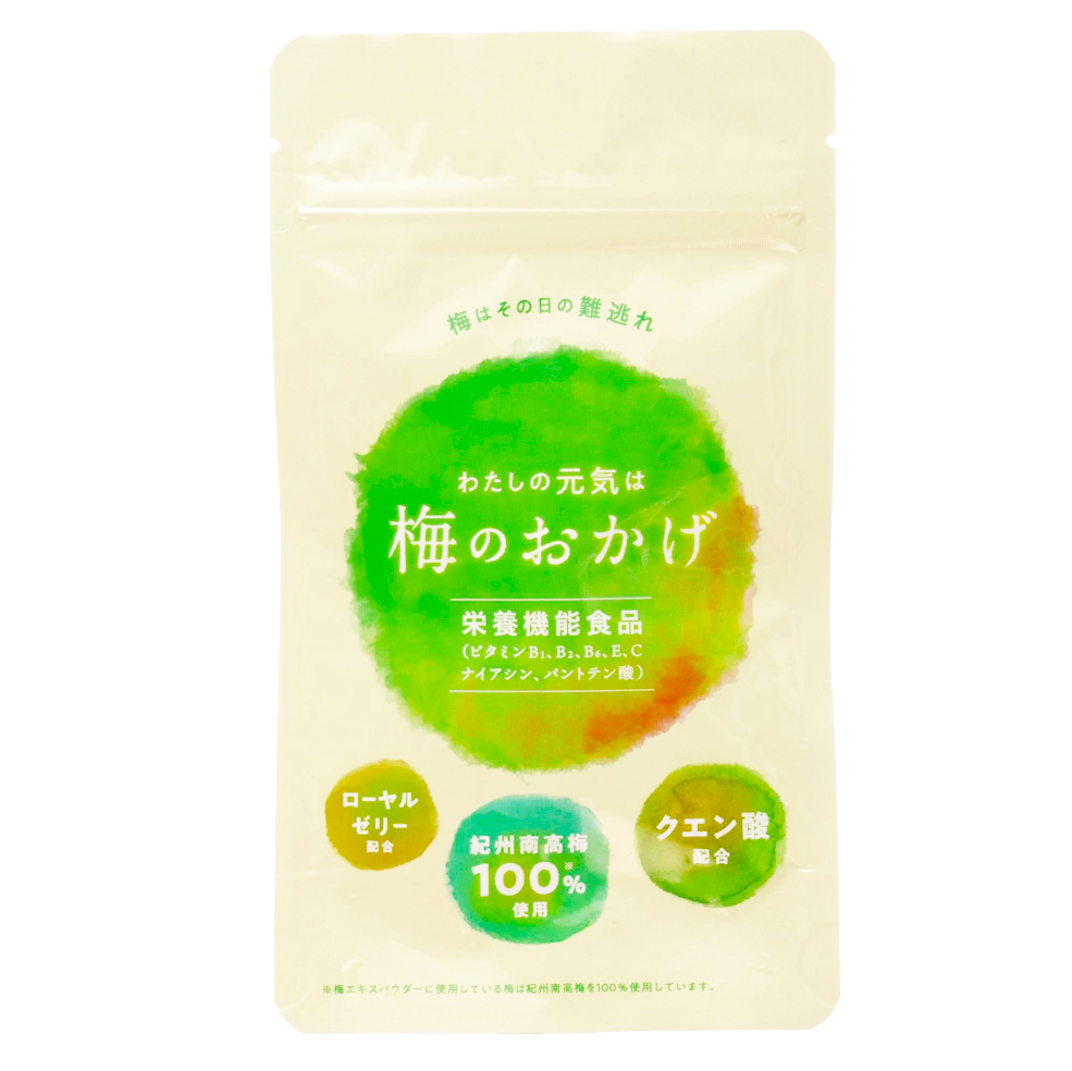 原材料: 梅エキスパウダー(梅エキス、デキストリン)(国内 製造)、ローヤルゼリー粉末/クエン酸、ゼラチン、加工デンプン、V.C、ナイアシン、 V.E(大豆由来)、パントテン酸Ca、V.B6、V.B2、V.B1、着色料(鉄クロロフィリンナトリウム)