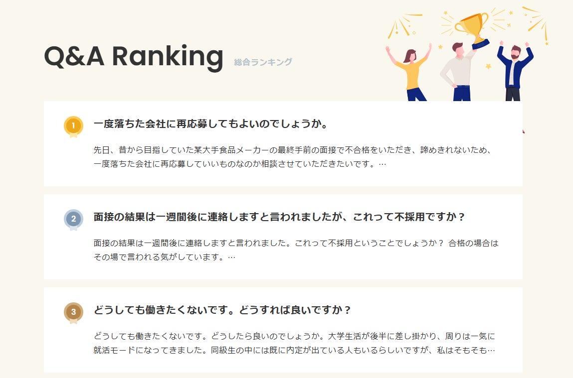 公開数が5,000本を突破した就活Q&Aは、就活生の悩みから若手社会人の転職活動まで、キャリアにおける幅広いフェーズに対応しています。膨大な情報の中で「情報迷子」となっているユーザーを正解まで導くことを目指します。