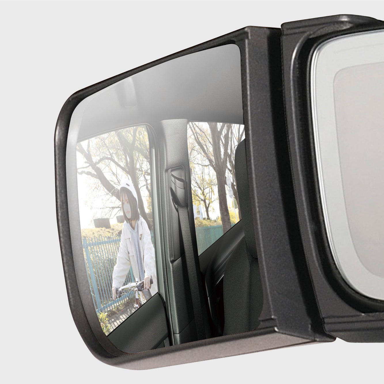 電子ミラーは左後方に死角があります。本製品は、電子ミラーにワイドミラーを被せるのではなく、左横に貼り付けるだけで広範囲を視認できるサブミラーです。左折時の巻き込み確認などにもおすすめです。
