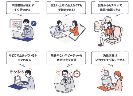 お客様からは「自宅や外出先などからも利用できるため、書類の提出や押印のために出社する必要がなくなった」「自動化によって業務効率が上がり、作業時間を大幅に短縮できるようになった」とのお声をいただいております。