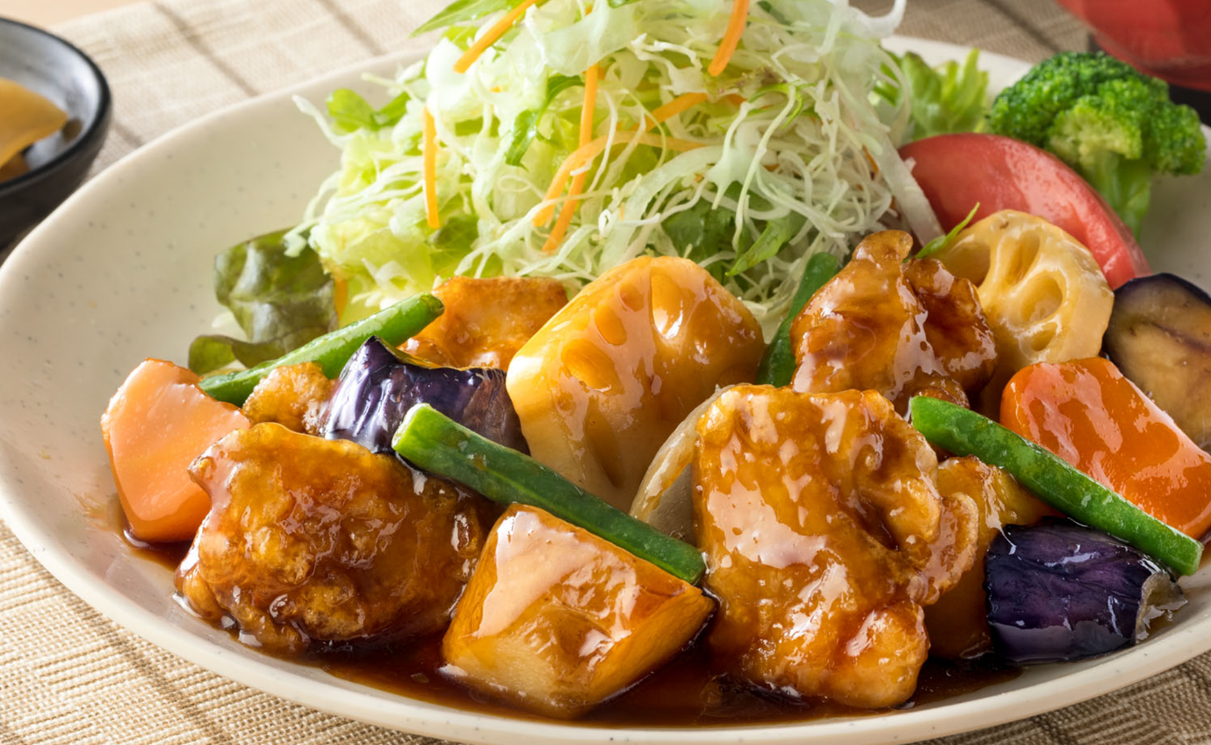 不動の人気NO.1メニュー!玄米黒酢と黒糖に、りんご酢で味を調えた、大戸屋オリジナルの黒酢あん。