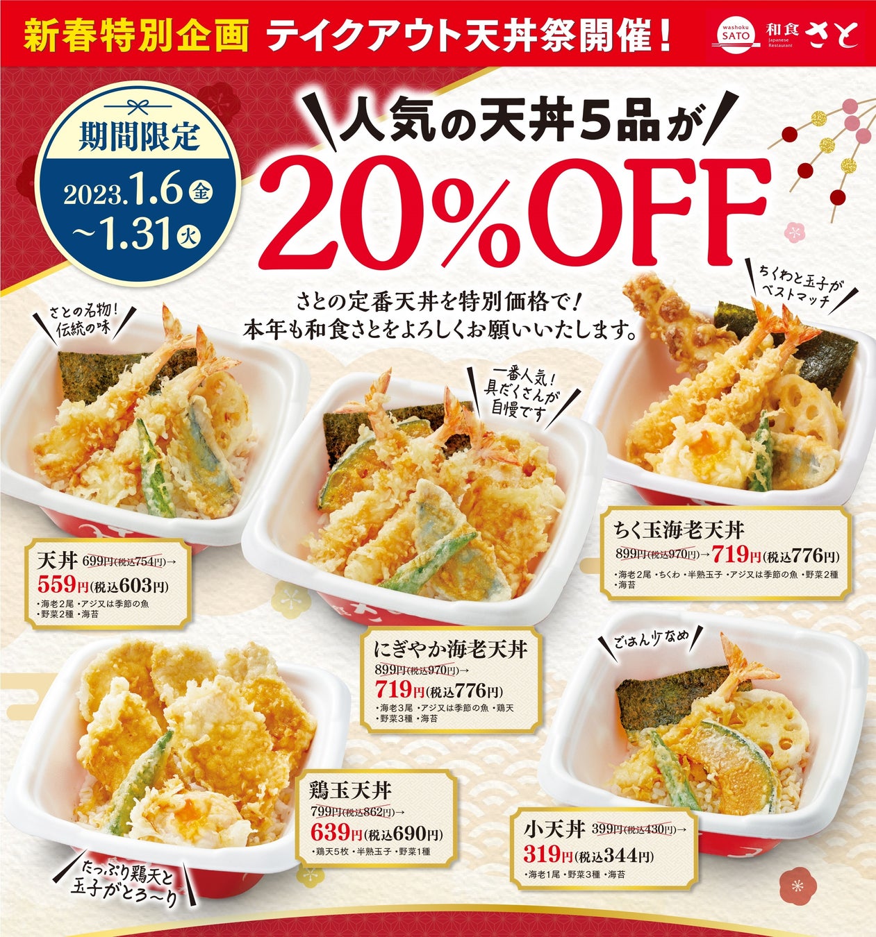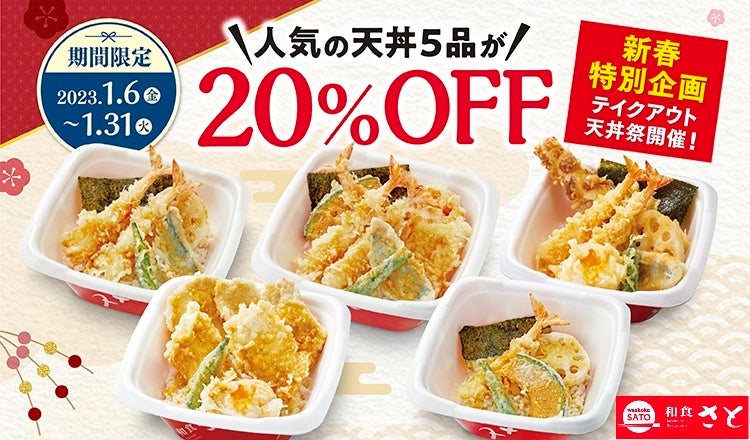 - ■2023年の「初天丼」は是非和食さとで!!! 新春企画「テイクアウト天丼祭」…人気の天丼5品が20%OFF!!!