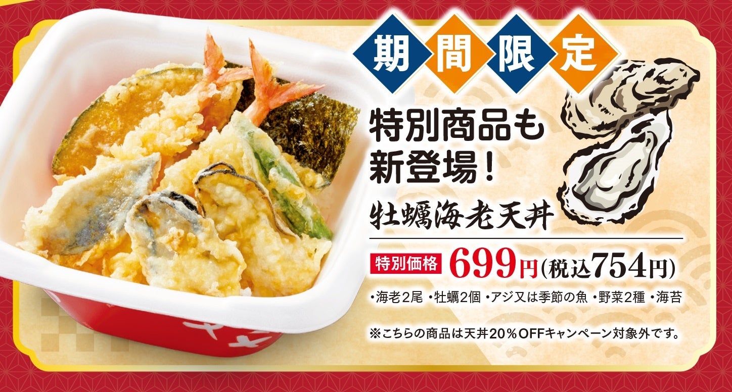 期間限定で牡蠣天2個(瀬戸内産)と海老天2尾・アジ・野菜天2種・海苔が入った「牡蠣海老天丼」が、特別価格754円で新登場!!!