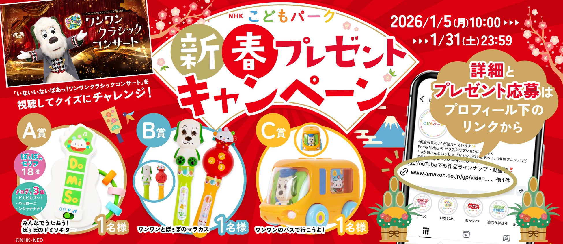 1月1日に迎えたワンワンのお誕生日を祝して、Prime Videoのサブスクリプション「NHKこどもパーク」では「いないいないばあっ!」グッズが当たるプレゼントキャンペーンを実施中!!先行配信作「ワンワンクラシックコンサート」を視聴してクイズに挑戦すると、抽選で3名様に「いないいないばあっ!」の素敵なグッズをプレゼントします!