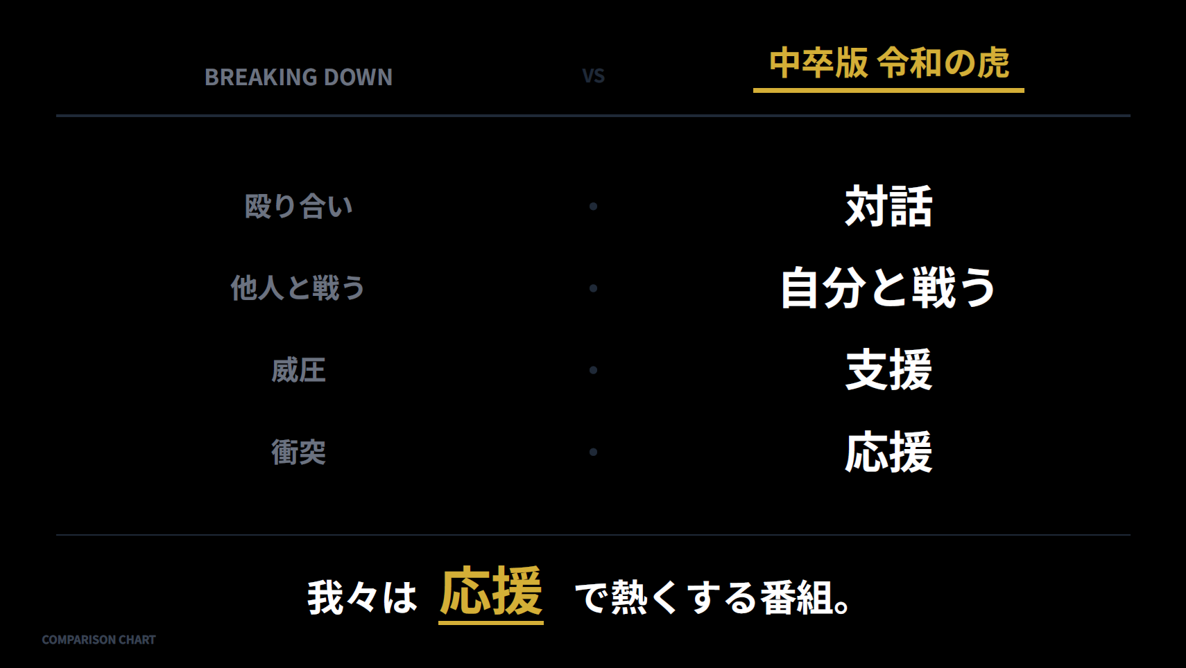 昨今注目を集める格闘技番組などが「殴り合い」「他人と戦う」「威圧」「衝突」を軸とするならば、『中卒版 令和の虎』は「対話」「自分と戦う」「支援」「応援」を軸とします 。