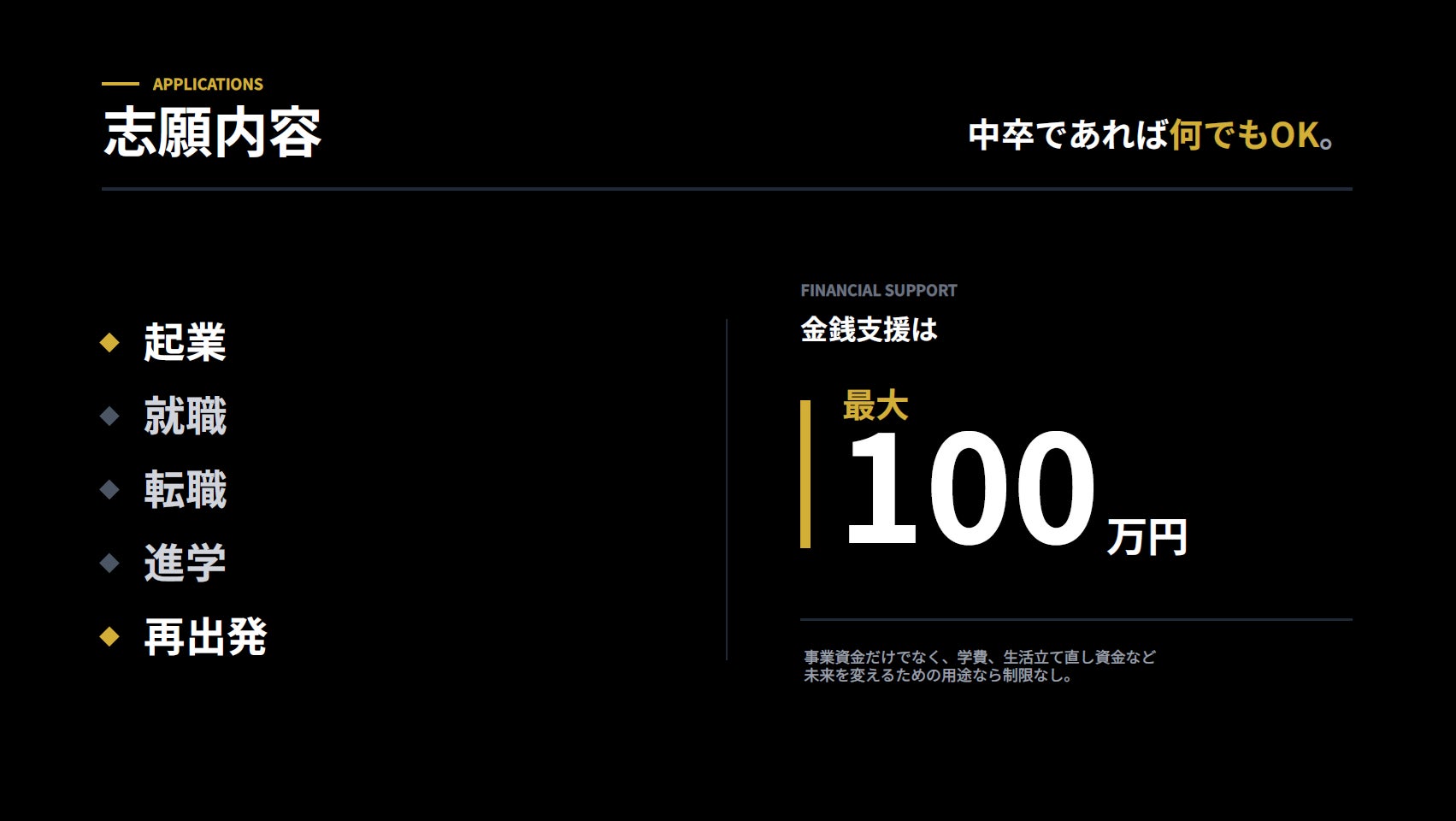 金銭支援は最大100万円です 。事業資金に限らず、学費や生活立て直し資金など、未来を変えるための用途であれば制限はありません 。出演者が全員中卒である性質上、品質保証やルールを守る保証ができないというリスクも開示していますが、「それでもやります」という強い覚悟で臨みます 。