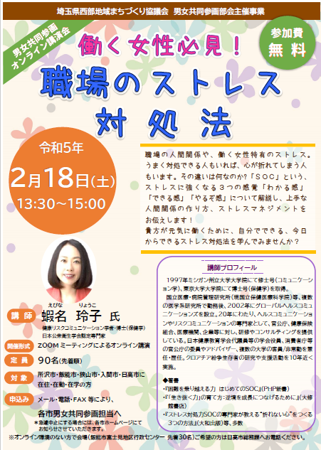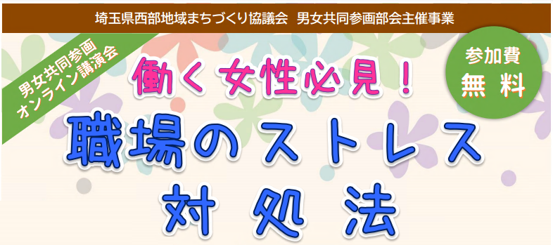 埼玉県西部地域まちづくり協議会が主催するオンライン講演会「働く女性必見!職場のストレス対処法」開催