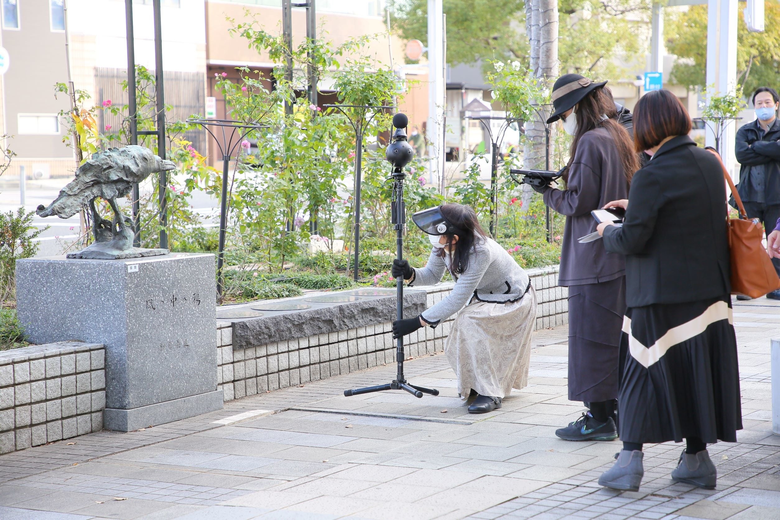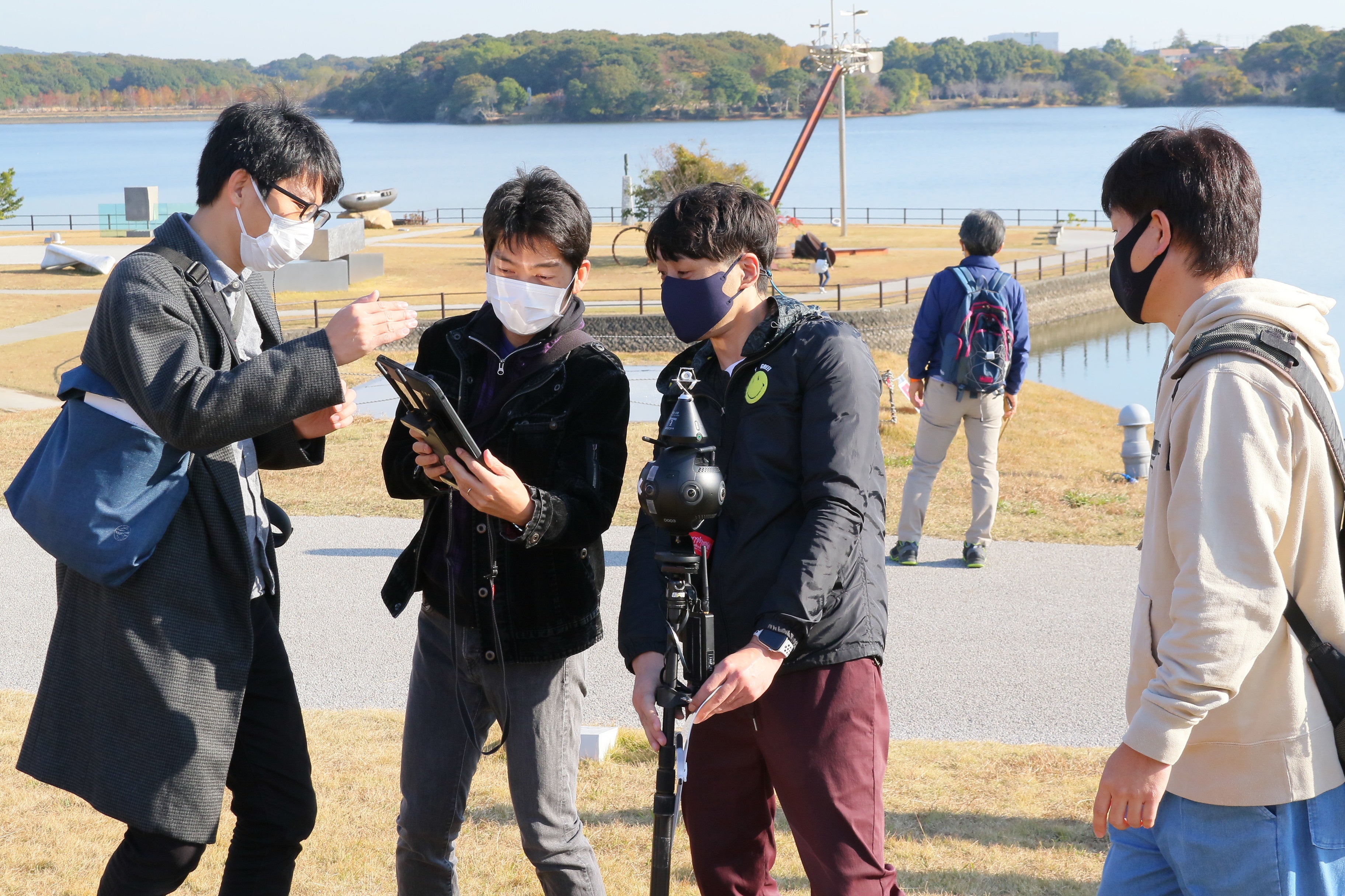 前述のXRワークショップを踏まえ、うべスタートアップ(うべ産業共創イノベーションセンター 志)を中心に計2日間の撮影体験を実施し、実写VRコンテンツの撮影手法やVR用撮影機器の操作方法などVR技術に関する幅広い知識を提供するとともに、宇部市民の方々のVRコンテンツ制作に対する意欲を高めることができました。手法について説明後、実際に参加者の方々とVR用のカメラやドローンを使用して宇部市内を撮影し、VRコンテンツとして「宇部中心市街地VR」を制作いたしました。技術・演出的なサポートを行いつつ、基本的には参加者からの意見を基に撮影を行い、本格的なVR撮影体験を提供しました。