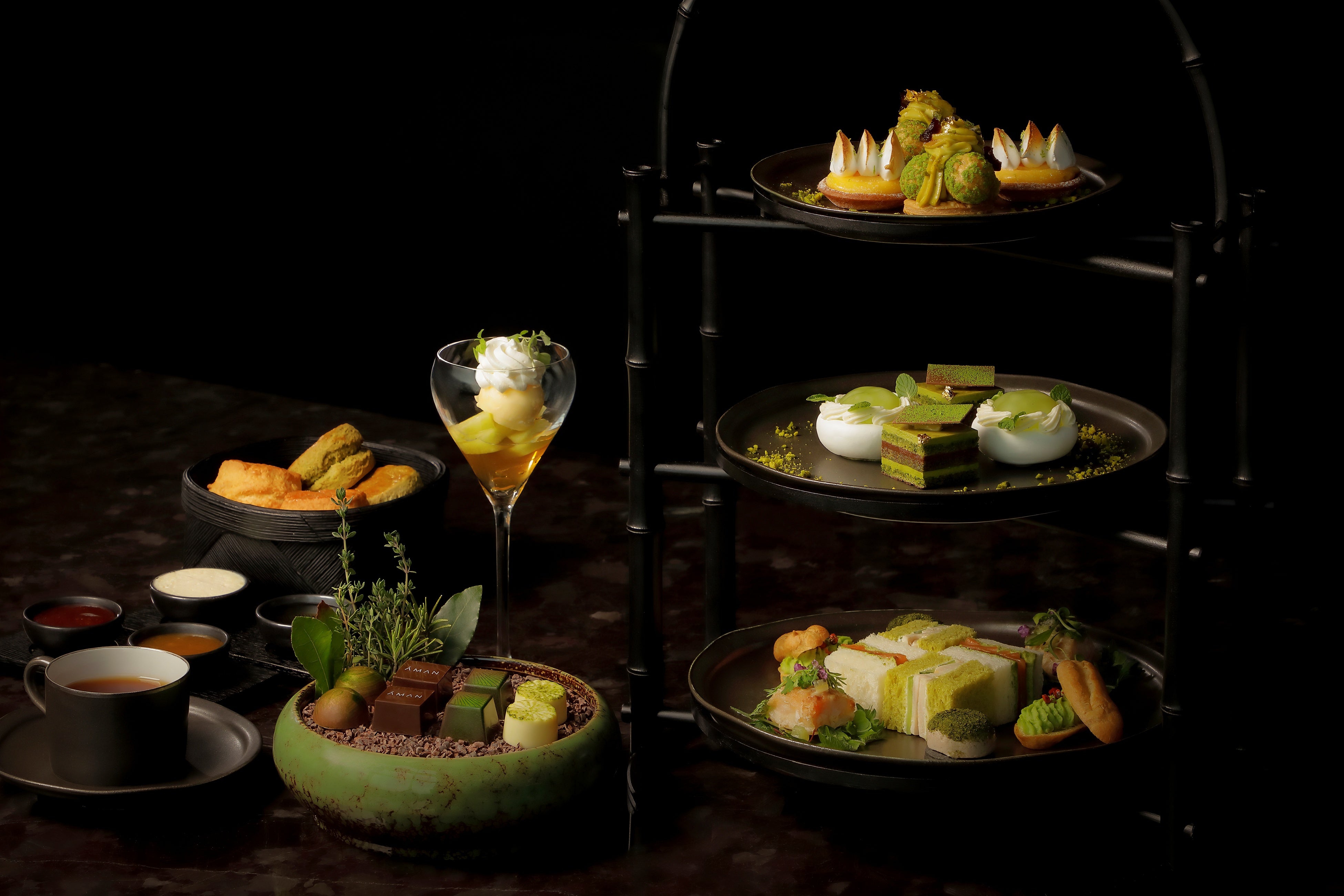 プレーンスコーンと抹茶スコーンには、季節のジャムを添えてお届けいたします。さらに、小さなプランターのプレゼンテーションが登場いたします。土に見立てたカカオの上に、タイムココナッツ、モヒート、ローズマリーパイナップル、アマン東京ガナッシュの4種のボンボンショコラを並べ、ハーブをあしらったプランターがシックな遊び心とともにティータイムを彩ります。
