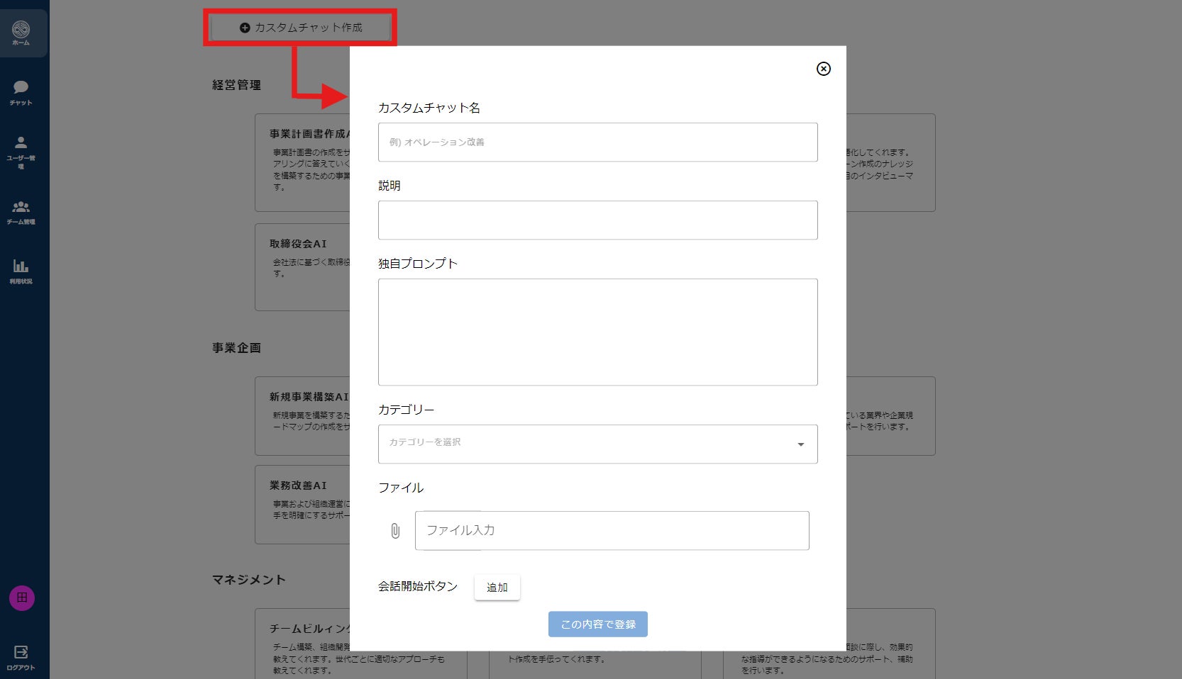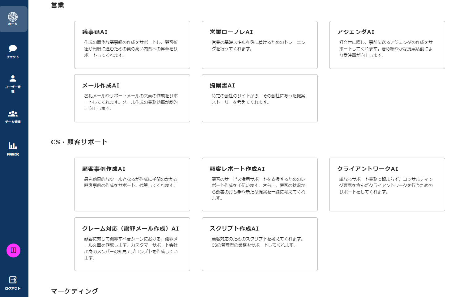 生成AIを活用した業務改善・オペレーション構築を生業としている当社がプロンプトを設計し、各業務のテーマ毎に専用のチャットを標準搭載しています。
