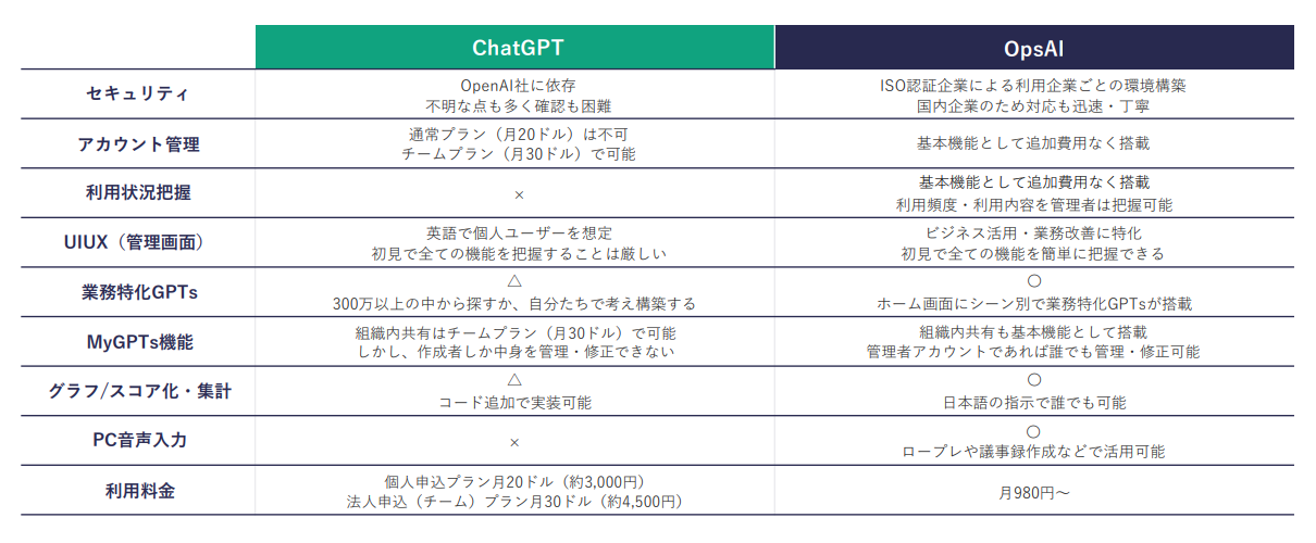 ChatGPTは海外個人ユーザー利用を想定しており日本企業にとって不要な機能も多くあります。一方で、OpsAIは日本企業の業務活用に特化した機能を搭載しています。また情報管理方法も、ChatGPTはすべてのユーザーの情報を一元管理して学習に使用していますが、OpsAIはOpenAI社とは切り離した環境かで構築し、学習に利用されることはありません。さらに利用企業ごとに管理区画を分けて徹底した情報管理を行っています。