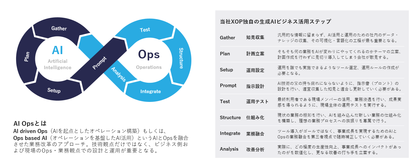 当社XOPは、Al Driven Ops(AIを起点としたオペレーション構築)もしくは、クライアント企業の状況に応じて、Ops Based AI(オペレーションを基盤したAI活用)というAIとOpsを融合させた業務改革のアプローチを取っています。技術観点だけではなく、ビジネス側および現場のOps・業務観点での設計と運用が重要となります。