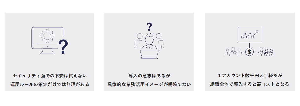 しかし、ChatGPTの導入を検討する企業が増加する一方で、ChatGPTのビジネス活用における課題に阻まれる事例も頻発していました。