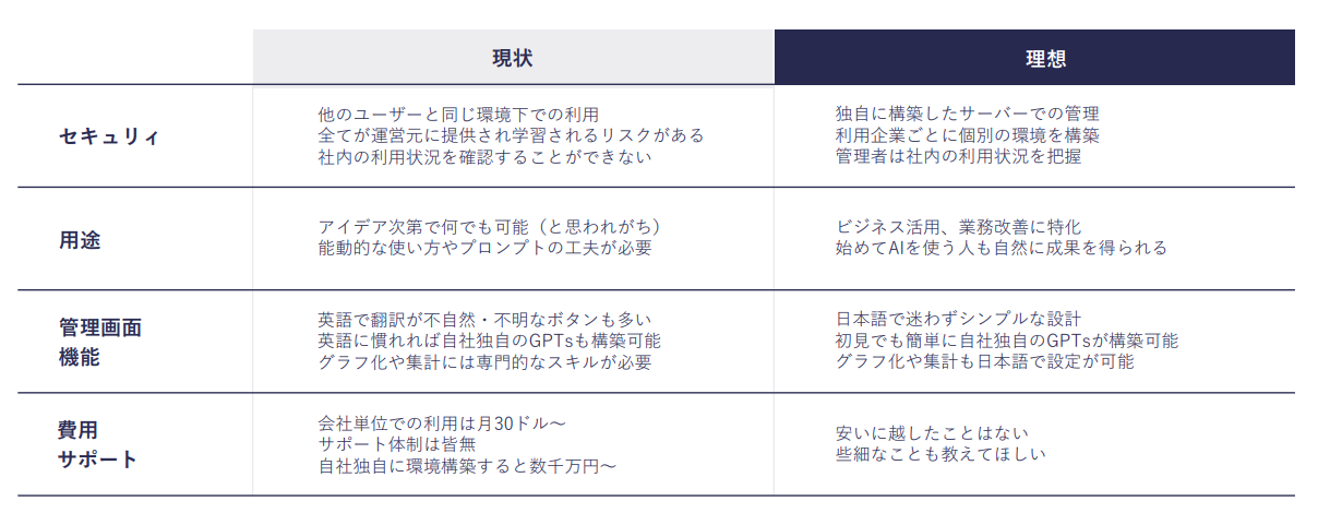 「OpsAI」は、ChatGPTのビジネス活用における課題を全てクリアにしています。