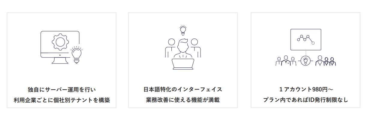 A.アカウント課金ではなく3プラン(トライアル9,900円/ベーシック29,000円/ビジネス49,000円いずれも税別)の月額料金となっております。アカウント換算すると1アカウント月980円~となっています。貴社のご状況や導入プランによって変動しますので、詳細表は資料をダウンロードいただきご確認ください。
