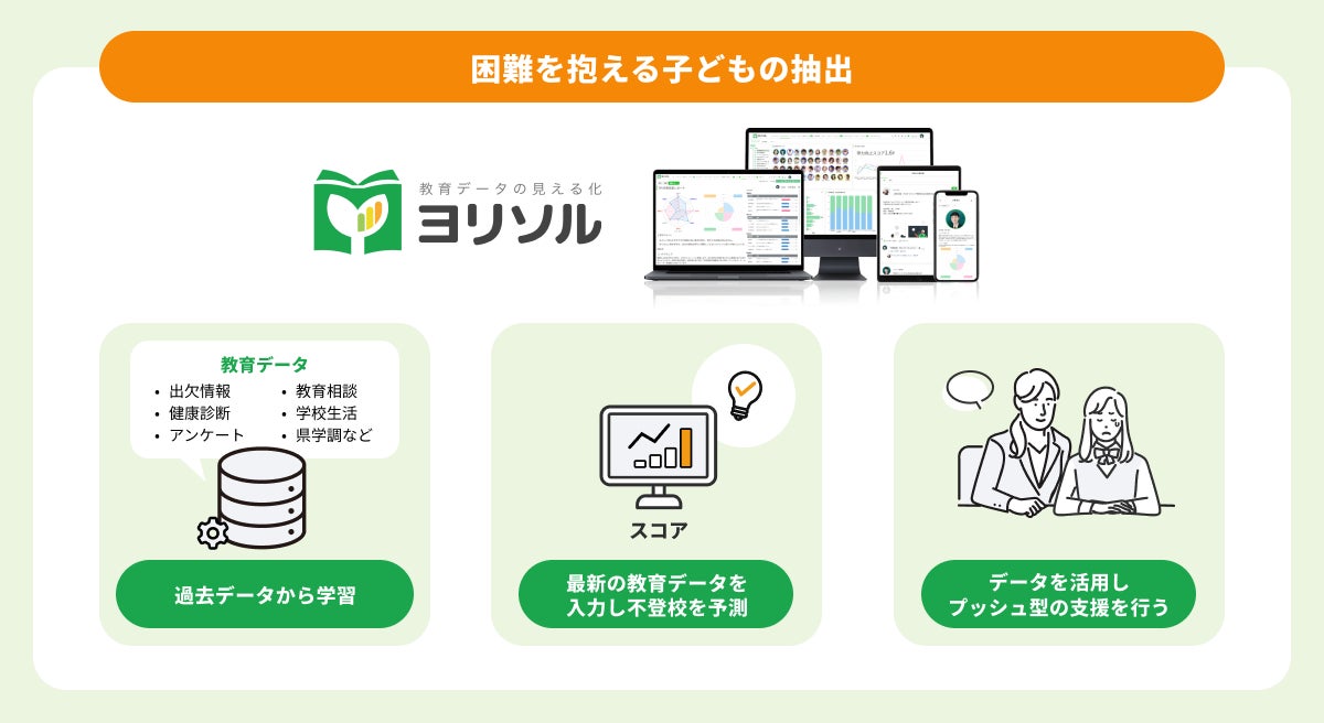 ・統合型スクールマネジメントシステム「ヨリソル」を提供し、喬木村が保有する様々なデータを「ヨリソル」上で統合・可視化し、AIを活用した分析を行うことで、支援が必要な子どもや家庭を早期に発見する仕組みを構築します。
