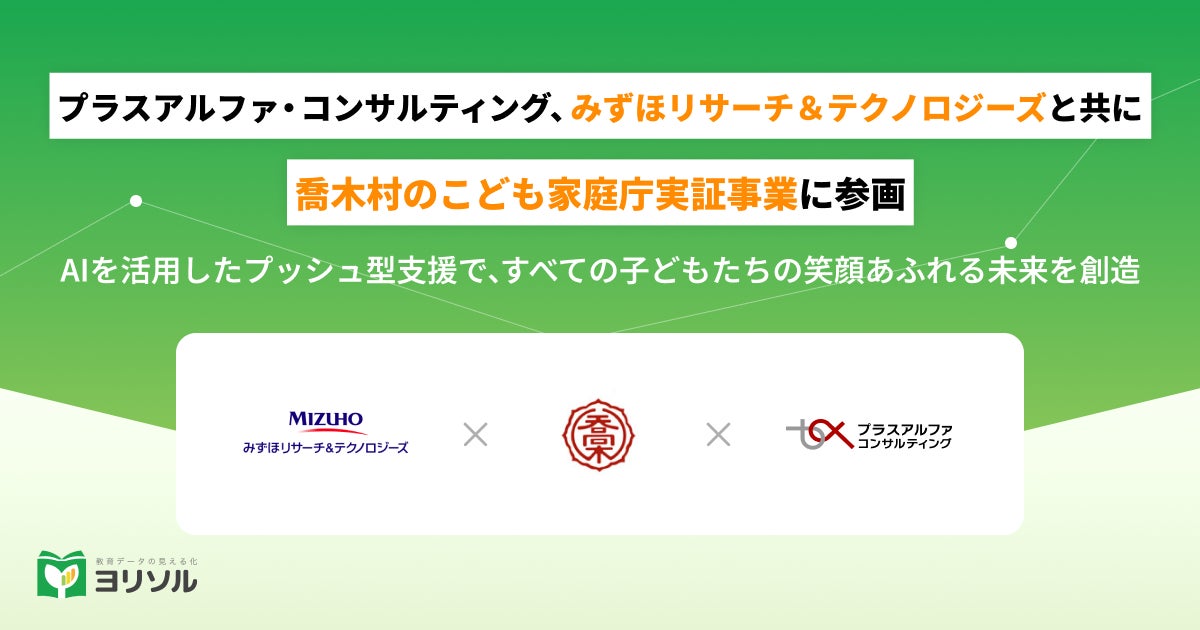 株式会社プラスアルファ・コンサルティング(本社:東京都港区、代表取締役社長:三室克哉、証券コード4071、以下:PAC)は、みずほリサーチ&テクノロジーズ株式会社(本社:東京都千代田区、取締役社長:吉原 昌利、以下:みずほリサーチ&テクノロジーズ)とともに、長野県喬木村(村長:市瀬直史、以下:喬木村)が採択されたこども家庭庁が実施する「令和6年度 こどもデータ連携実証事業」において、教職員の負担軽減と教育DXの実現を支援する統合型スクールマネジメントシステム「ヨリソル」の提供を通じて、AIを活用したプッシュ型子育て支援の高度化を推進することをお知らせいたします。