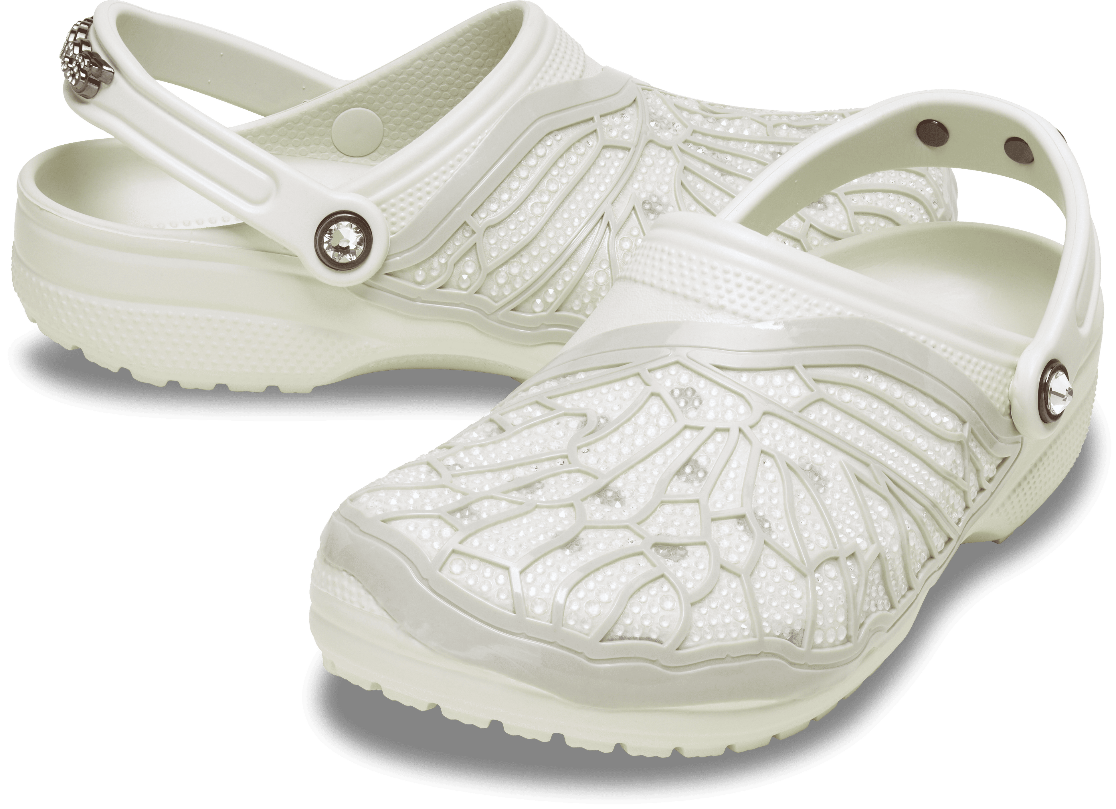 「スワロフスキー クロックス クラシック クロッグ」は、真珠のように艶めくアイボリーカラーのクラシッククロッグをキャンバスに、繊細で虹色に輝くトンボの羽が、Swarovski®クリスタルによって美しく表現され、左右のシューズを優雅に横断しています。さらに、ヒールストラップには、Swarovski®クリスタルをあしらった眩いCrocsロゴが配され、ヒールからつま先まで、プレミアムな存在感を演出します。静謐でありながら贅沢なこの一足は、まさに「纏うアート」であり、コレクターズアイテムにふさわしい逸品です。
