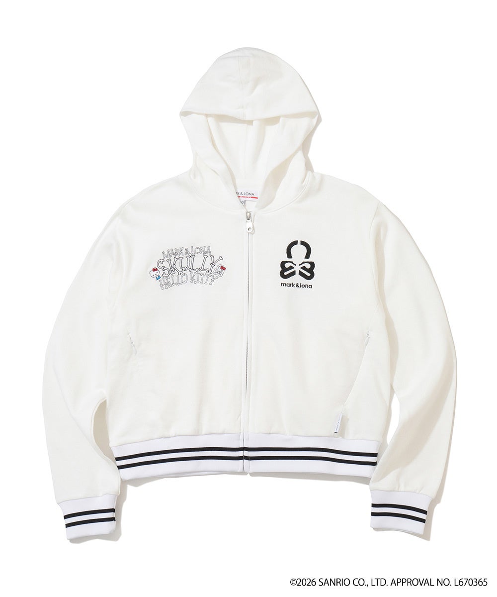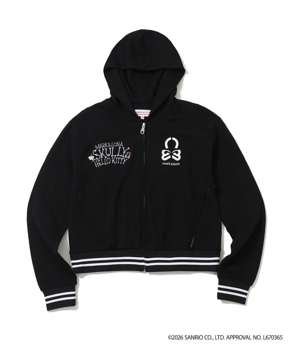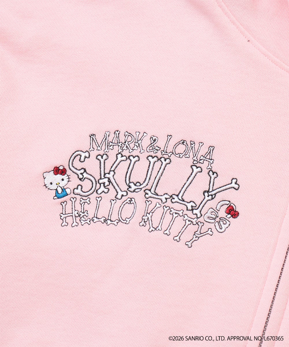 ピンク、ブラック、ホワイトの3色で展開する本作は、ハローキティとのスペシャルコラボレーションロゴ「Skully×Hello Kitty」をあしらったデザイン。胸元には今シーズンを象徴するアイコン「エレメントスカル」も施し、遊び心あふれる表情に仕上げました。発泡プリントの立体感と繊細な刺繍を組み合わせることで、ポップさの中にもMARK & LONAらしいアイコニックな存在感を演出しています。着るだけで気分が上がる、ポップでキャッチーなコラボレーションアイテムです。素材には、毛羽立ちを抑えた上質なコーマ糸による、ソフトな膨らみのコットン裏毛を採用。軽量でストレスフリーな着心地を実現しながら、ややオーバーサイズな身幅と短めの着丈を掛け合わせた、トレンド感溢れるシルエットとなっています。