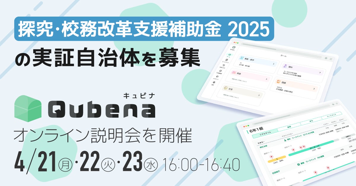 学習eポータル+AI型教材「キュビナ」を開発・提供する株式会社COMPASS(本社:東京都文京区、代表取締役:佐藤 潤、以下 COMPASS)はこのたび、経済産業省が実施する「探究・校務改革支援補助金2025」の事業者として採択されましたことをご報告いたします。採択に伴い、AI型教材「キュビナ」の実証自治体・学校の募集を開始いたします。また、オンライン説明会を開催し、「キュビナ」のサービス紹介および「探究・校務改革支援補助金2025」のお申し込みについてご説明いたします。