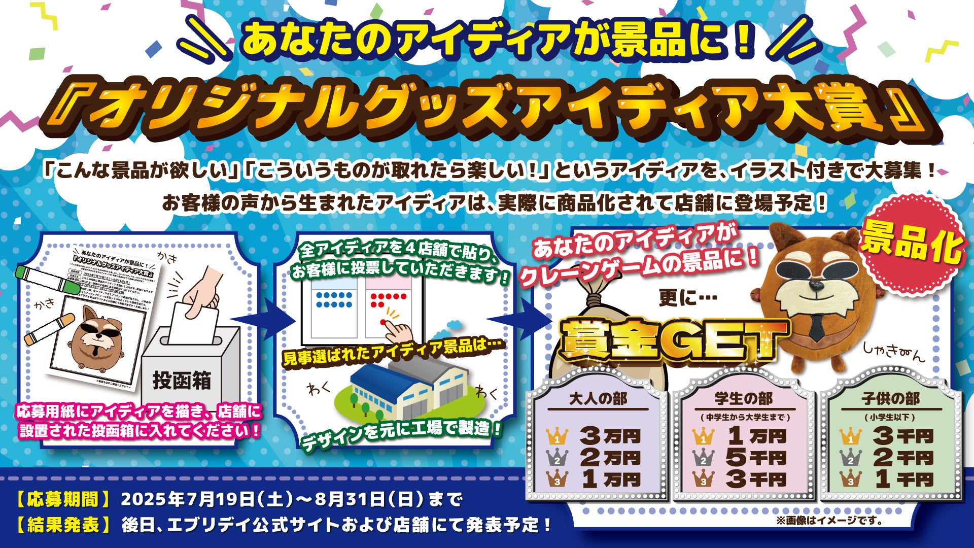 「笑顔創造」が企業理念の株式会社東洋(代表取締役:中村秀夫/本社:埼玉県桶川市以下、当社)は、運営するクレーンゲームのテーマパーク「エブリデイ」にて、2025年7月19日(土)から8月31日(日)まで開催した「オリジナルアイディア大賞」において、一次審査および二次審査を経て、各部門の受賞者が決定いたしましたのでお知らせいたします。