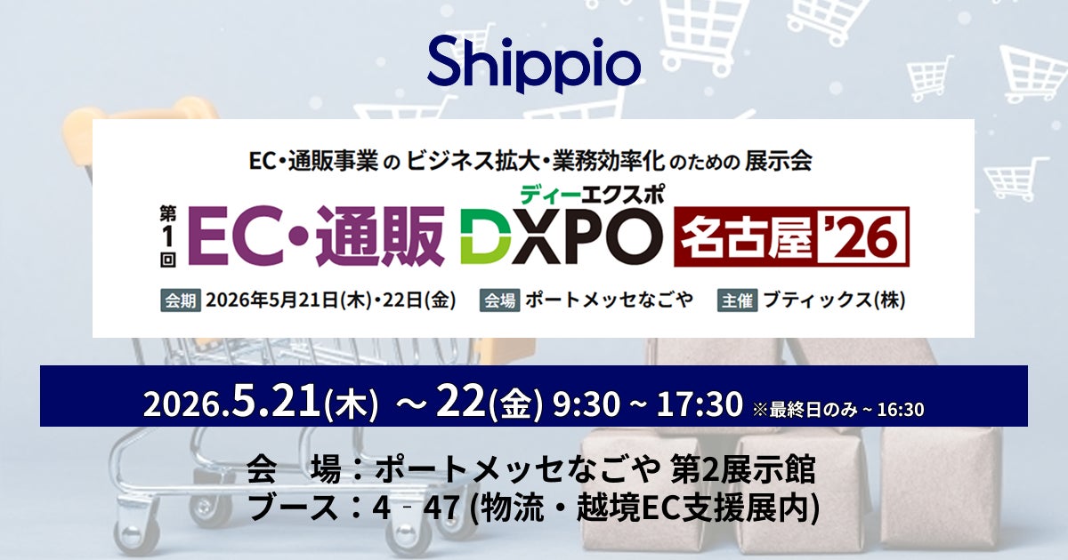 貿易DXを推進し「Shippio Platform」を運営する株式会社Shippio(本社:東京都港区、代表取締役CEO:佐藤 孝徳、以下Shippio)は、2026年5月21日(木)~ 22日(金)にポートメッセなごやで開催される「EC/通販DXPO名古屋’26」に出展いたします。