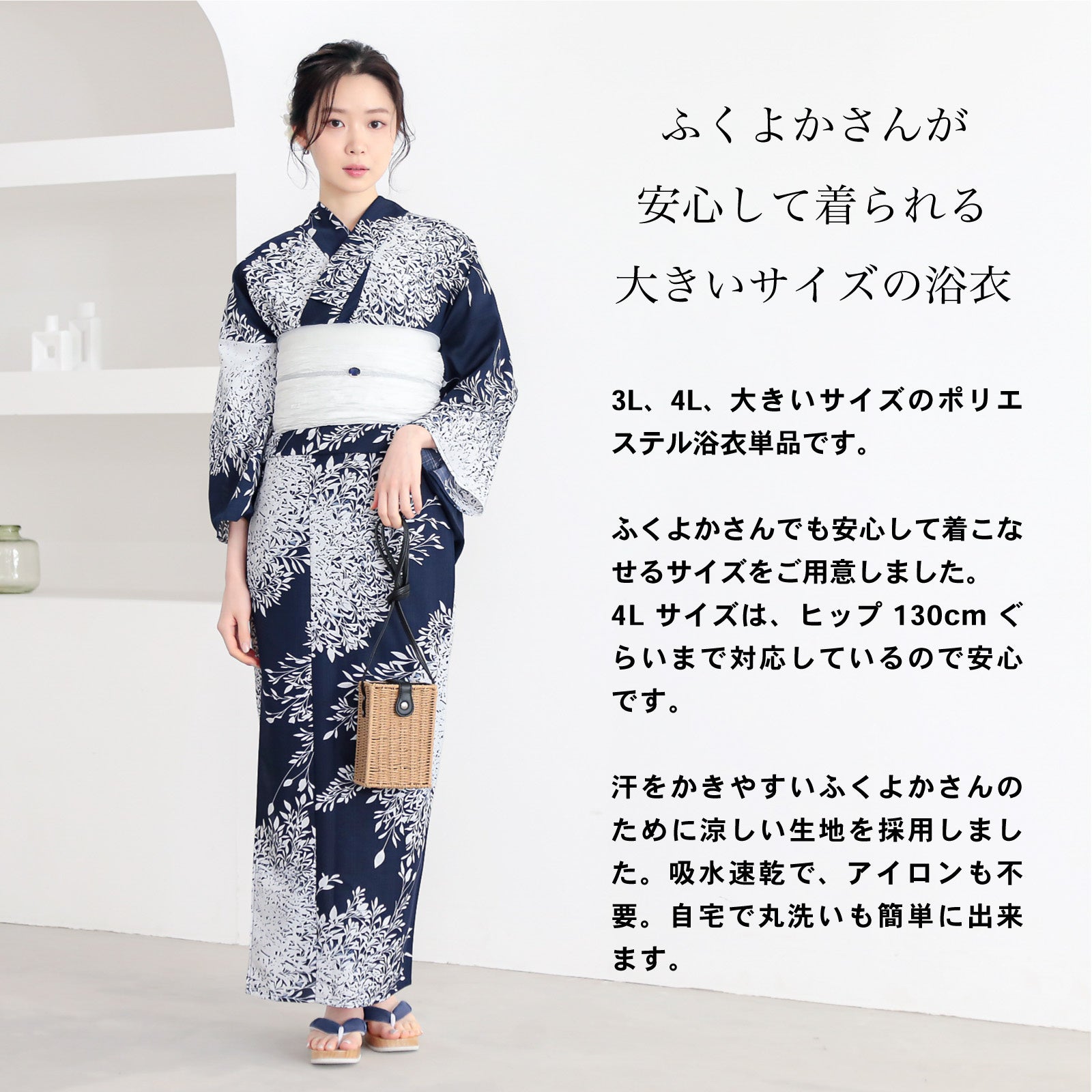 素材は吸水速乾が魅力のポリエステル100%。夏の暑い時期にも肌につかず涼し気に着こなせます。S/F/TL/LLに加え、3L/4Lも取りそろえた豊富なサイズ展開もうれしいポイント。低身長さんやふくよかさんなどフリーサイズの浴衣では合わない方にも着こなしていただけます。