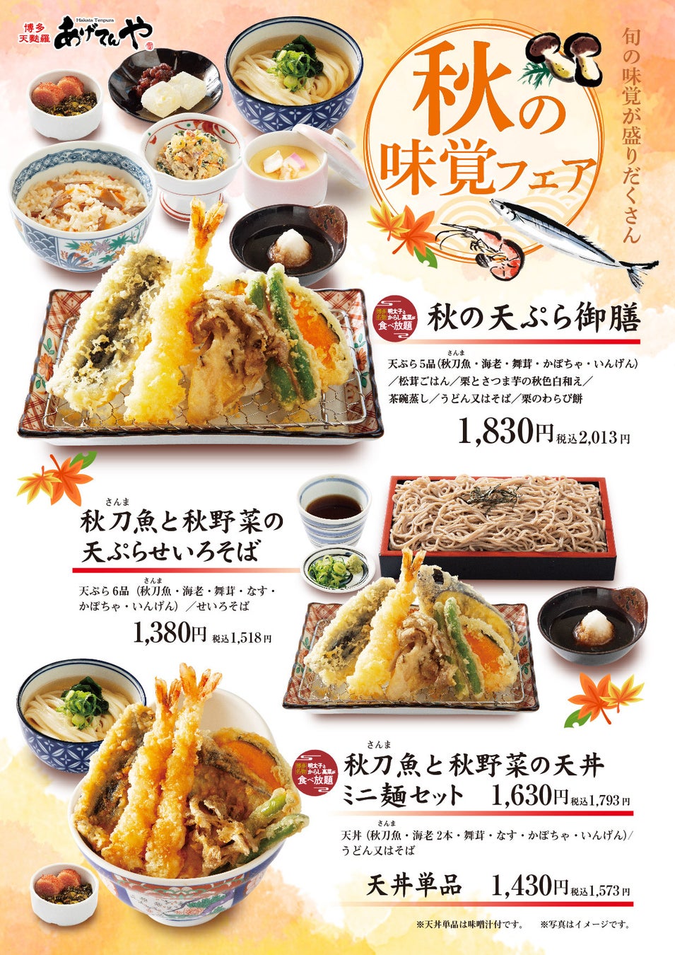春夏秋冬、季節ごとの旬の素材をこだわりの「新鮮な油」を使用して、サクッと香ばしく揚げた天ぷらが自慢の「あげてんや」名古屋イオンモール大高店では9月5日(木)より期間限定で「秋の味覚」をテーマにしたメニュー3種類を開始しています。秋グルメの代名詞である「さんま」に「舞茸」「かぼちゃ」「いんげん」「松茸」「栗」「さつま芋」など食べごろの食材を揃えました。せいろそばなどと