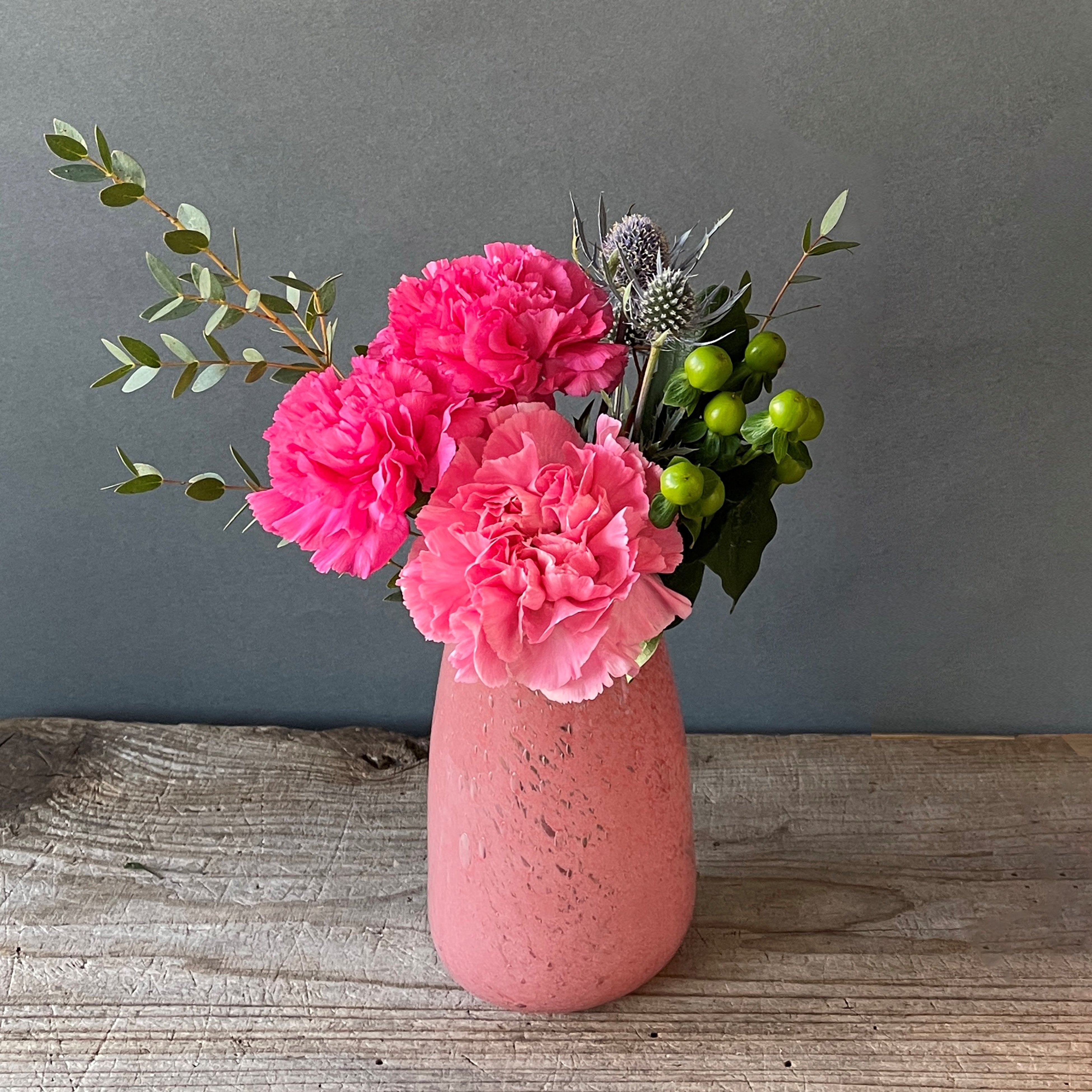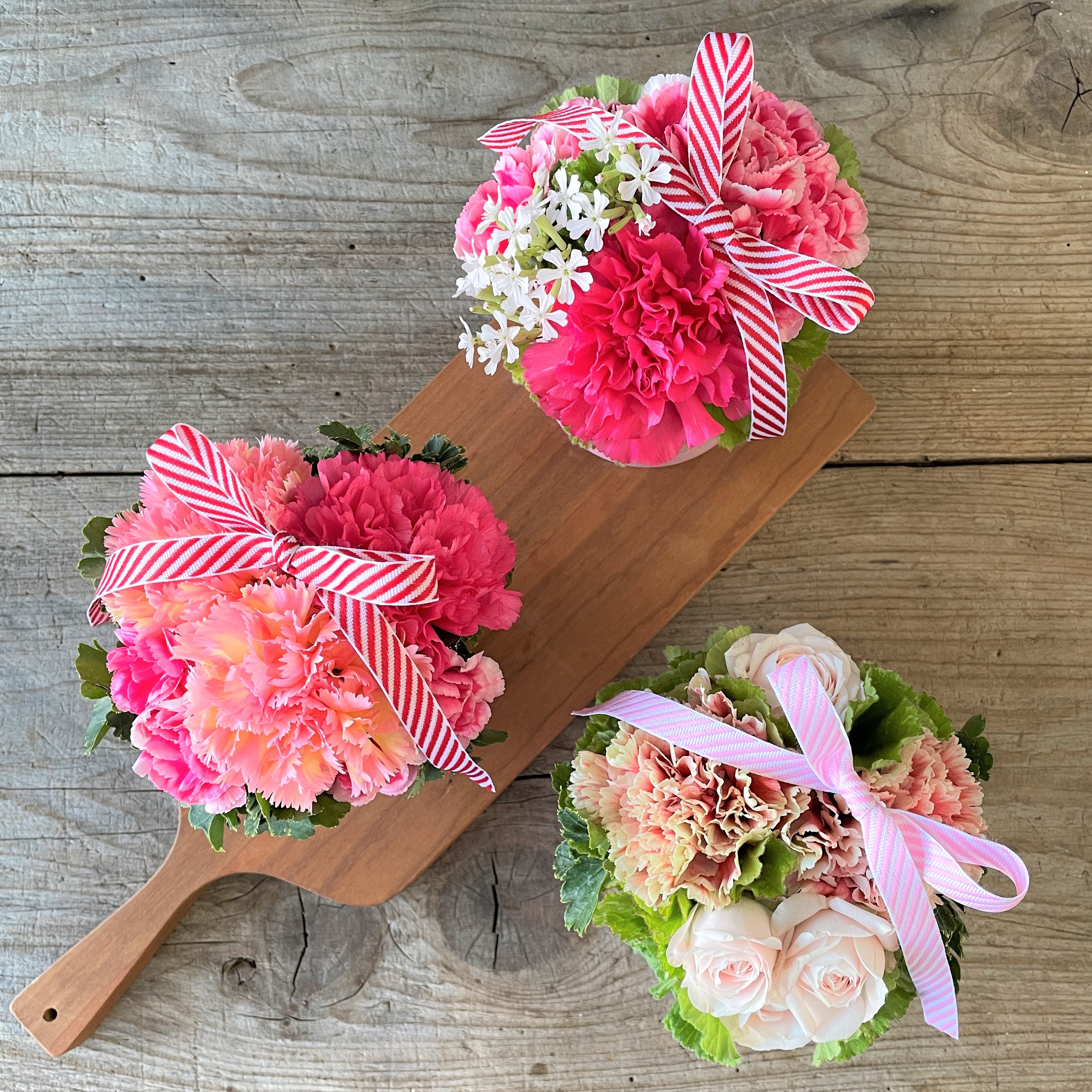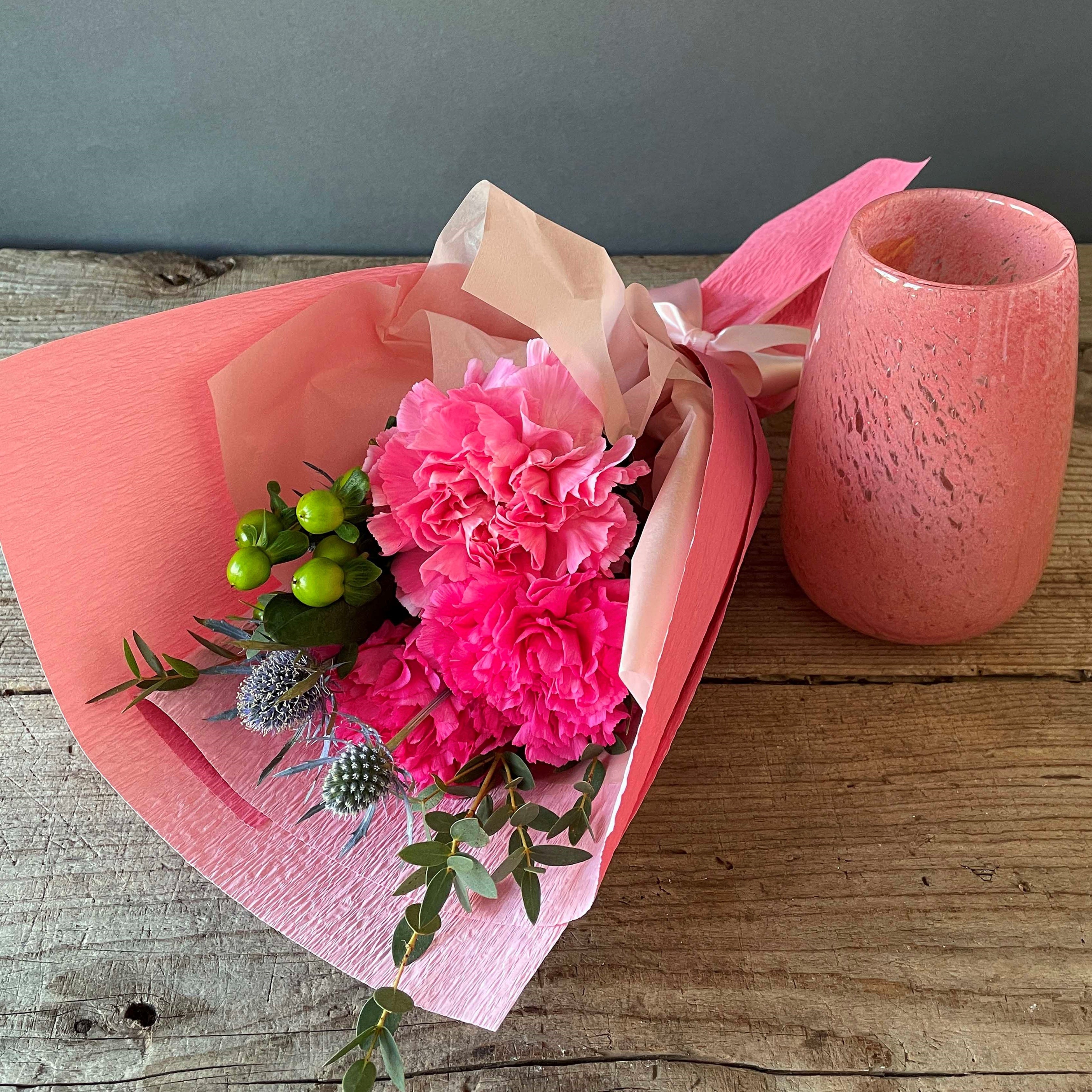 ショップおすすめのカーネーションと小花をかわいらしいブーケに仕上げました。ちょっとした贈り物やご自宅用にもおすすめです。もちろん母の日にも!