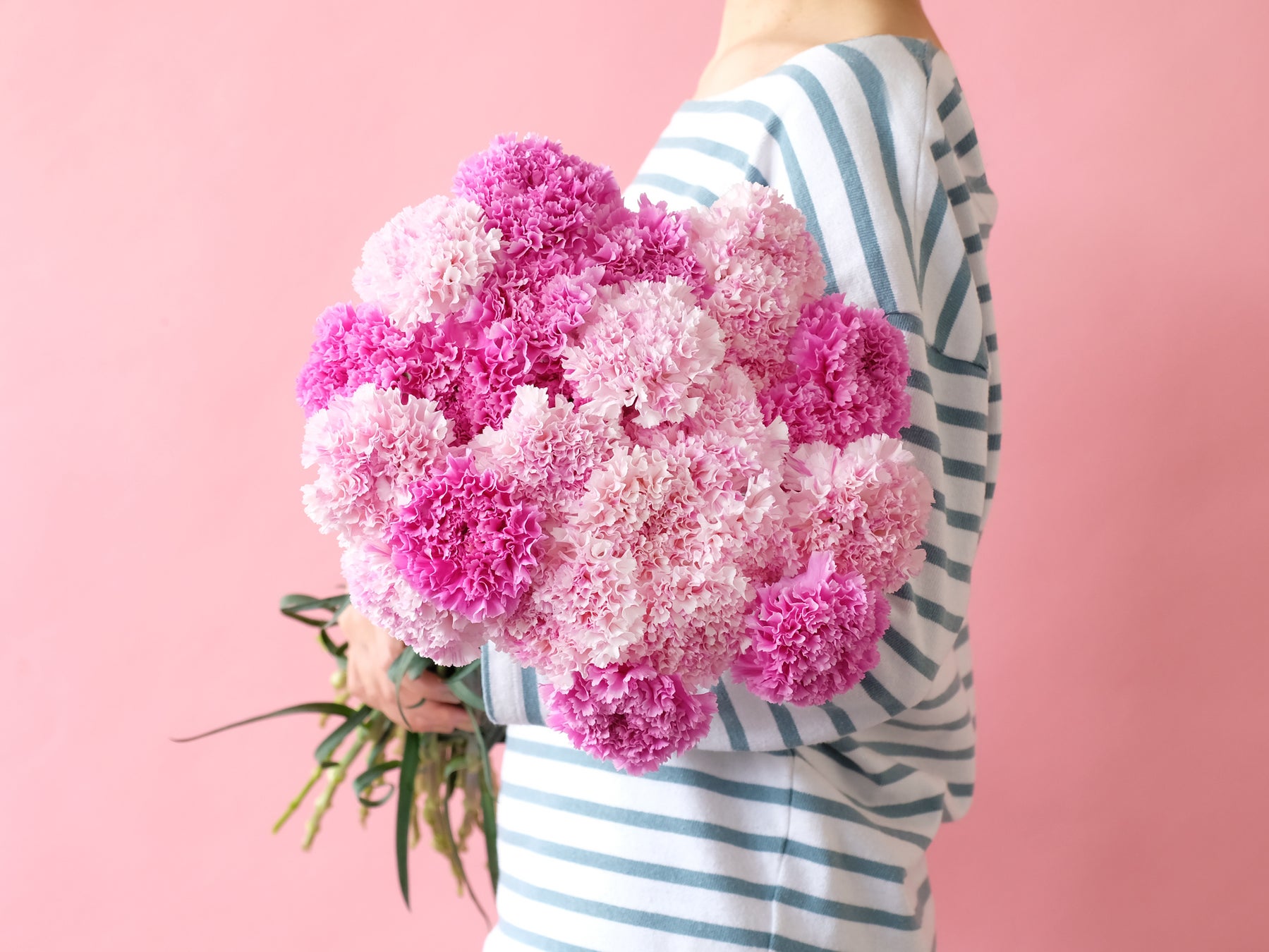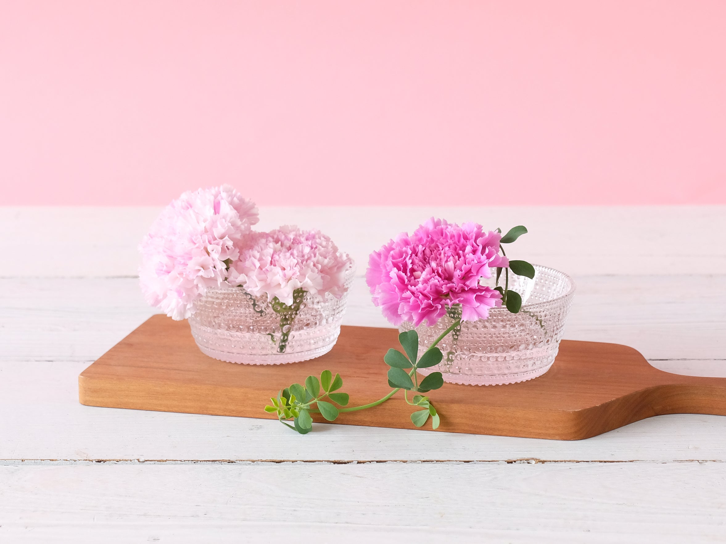 しかしカーネーションは、母の日だけではもったいない魅力のある花です。まるでフリルのような花びらが重なり合う花と、すらりと伸びる繊細な茎や葉のコントラストが魅力で、優しい香りも楽しむことができます。また繊細に見えて日持ちの良いことも魅力のひとつです。花屋さんで扱う花の中でも日持ちはトップクラス。何かと忙しい5月には、お手入れが楽な旬の花、カーネーションを日常に取り入れてみませんか。