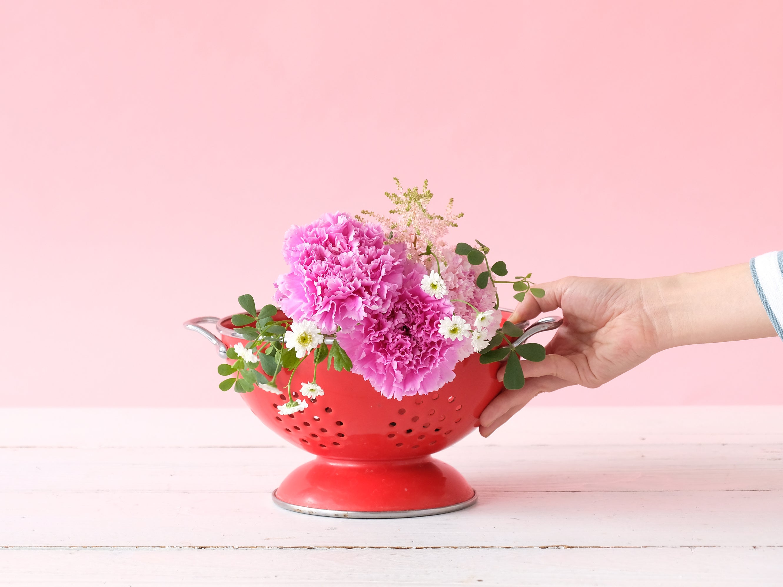 左上:カーネーションと季節の小花をコップに入れてコランダーにセット。キッチンや食卓にぴったりな花あしらいです。