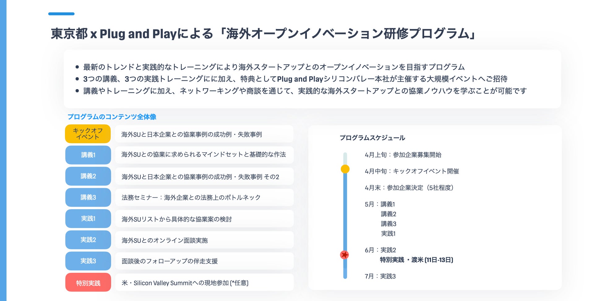 Plug and Play Japan株式会社(本社:東京都渋谷区、代表取締役社長:ヴィンセント・フィリップ、以下「Plug and Play Japan」)は、東京都(知事:小池 百合子)が2023年11月よりオープンした、国内外からスタートアップに関わる様々な団体を集め、スタートアップへの重点的な支援を提供する一大拠点となる「Tokyo Innovation Base」(以下、TIB)にて、大手企業向けに海外スタートアップとのオープンイノベーションを促進する「海外オープンイノベーション研修プログラム」を期間限定で開始いたします。また、本プログラム開始に伴いキックオフイベントを2024年4月23日(火)にTIBにて開催いたします。