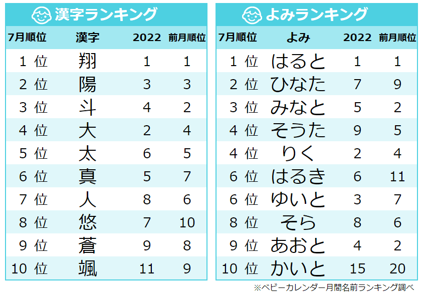 6月3位から順位を上げて7月に首位を獲得した「陽翔」。「陽」は、日の当たる丘を指す漢字で、太陽が照り付ける7月らしい名前の一つです。「陽」がつく名前はTOP50以内に7つもランクイン。「陽翔」のほか、6位「陽向(主なよみ:ひなた)」、11位「朝陽(主なよみ:あさひ)」、12位「陽太(主なよみ:ひなた)」、22位「陽大(主なよみ:ひなた)」、31位「陽斗(主なよみ:はると)」、45位「陽奏(主なよみ:ひなた)」といった名前が人気でした。