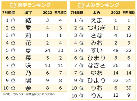 7月に生まれた女の子の名前のよみランキングTOP3は、1位「えま」、2位「つむぎ」、3位「さな」となりました。夏生まれに多く名付けられる「夏ネーム」の一つ「なぎさ」が、6月から引き続きTOP10にランクイン。その他にも、夏を連想させる「なつき」は6月100位以下の圏外から7月49位に、「こなつ」も6月圏外から7月は75位にランクアップしました。