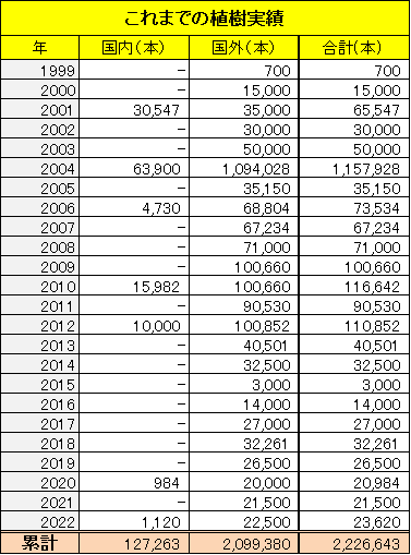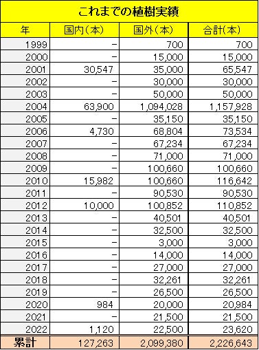 当社は1999年から植樹活動を行っており、これまでに国内やネパール、中国などで222万本以上の木を植えてきました。今後も植樹活動を続け、本物の森づくりに貢献してまいります。
