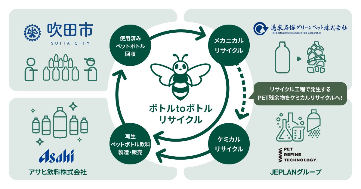 株式会社JEPLAN(代表取締役 執行役員社長:髙尾 正樹、以下「JEPLAN」)のグループ会社であるペットリファインテクノロジー株式会社(代表取締役 執行役員社長:伊賀 大悟、以下「ペットリファインテクノロジー」)は、大阪府吹田市(市長:後藤 圭二)、アサヒ飲料株式会社(代表取締役社長:米女 太一、以下「アサヒ飲料」)、遠東石塚グリーンペット株式会社(代表取締役社長:安田 真一、以下、「遠東石塚グリーンペット」)とともに、日本国内のPETボトルの循環利用の推進を目的とした「ペットボトルのボトルtoボトル(水平リサイクル)推進事業に関する協定書」を10月10日(金)に締結しました。